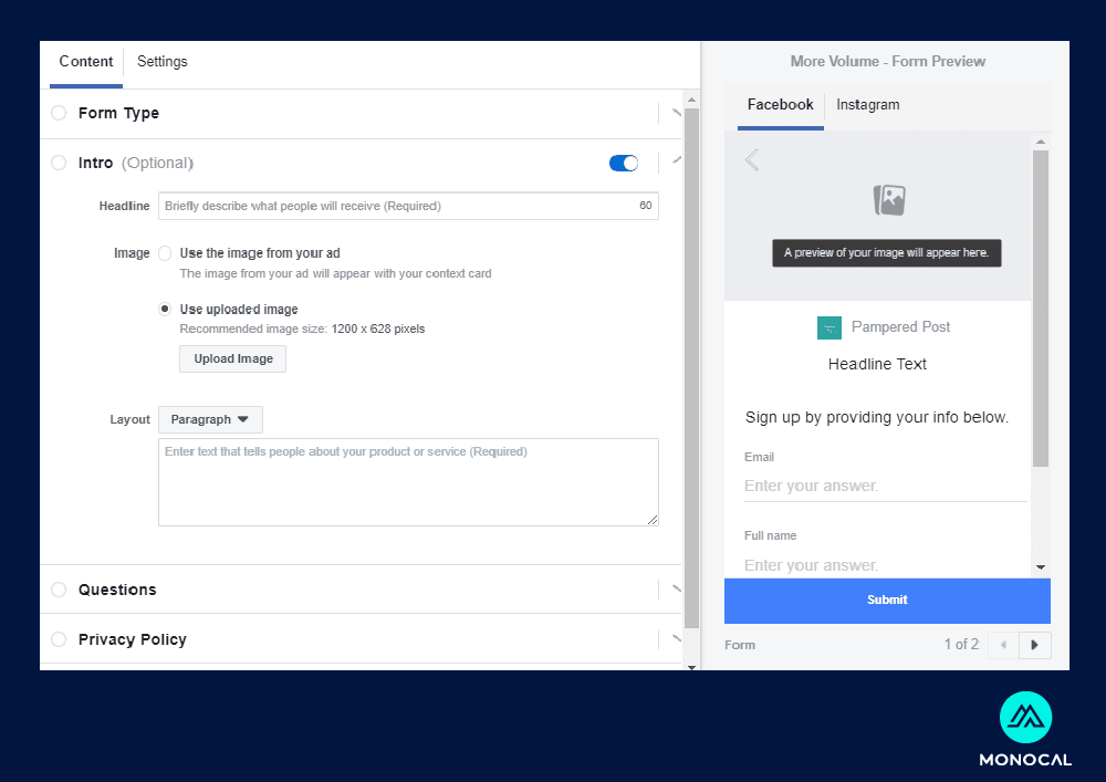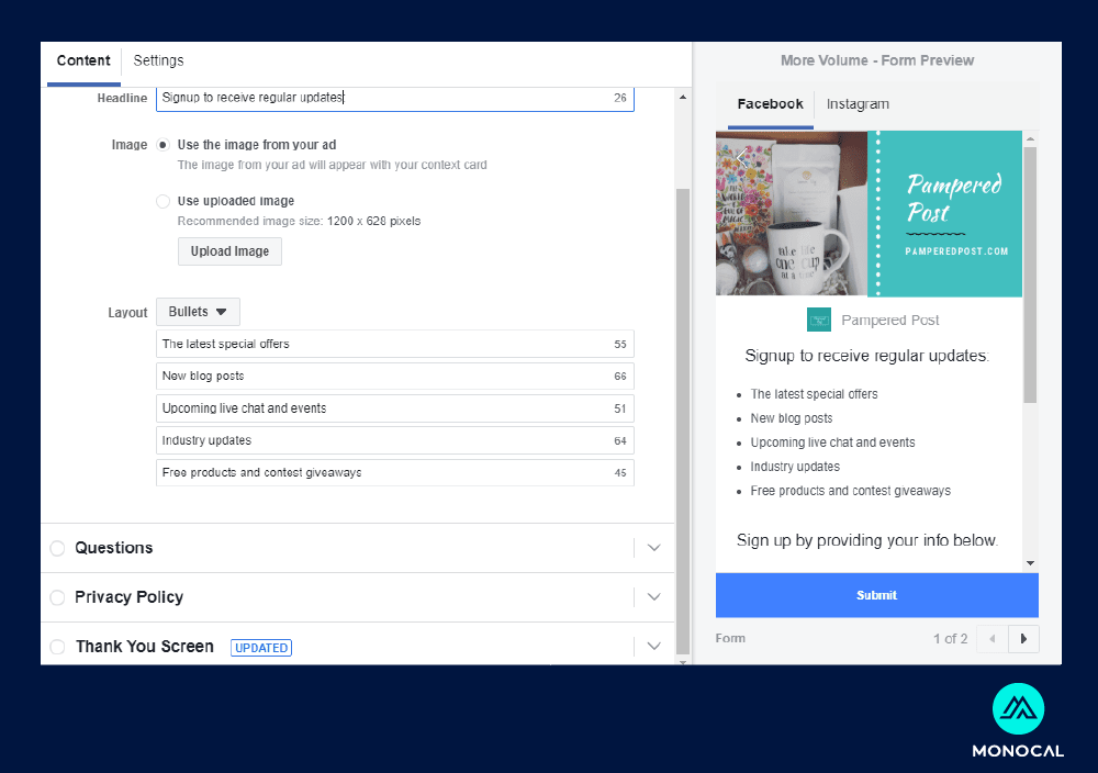 Akan tetapi, jika di Facebook, proses ini menggunakan Instant Form, dimana anda boleh kumpulkan maklumat seperti, nama, emel, nombor telefon dan banyak lagi.